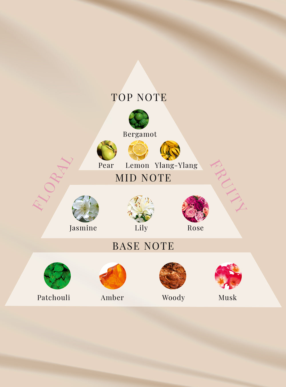 The opening is a sparkling accord of bergamot, pear and lemon, touched with the exotic brightness of ylang-ylang.
